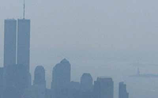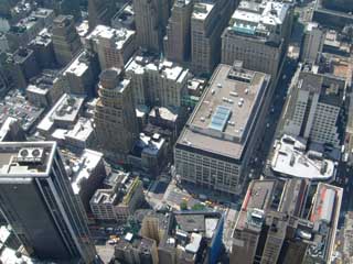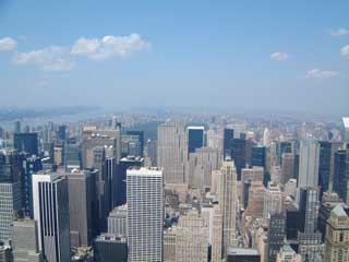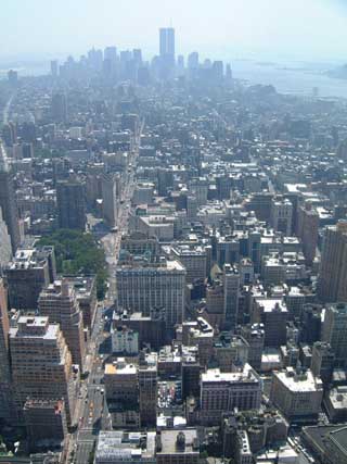 and this is the view from the empire state south down fifth ave towards the financial district. the biggest skyscrapers are the twin towers of the world trade centre. in this picture on the water to the right is the statue of liberty but from this distance you can barely see it.