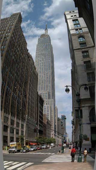 new york city! the only place i've ever been that is worthy of the title 'city' and where the place itself is the biggest attraction. this is the empire state building. it is over 100 stories tall and i had to take this photo as 4 shots and put it together. check out the curving distortion on the buildings on either side because of the camera lense.