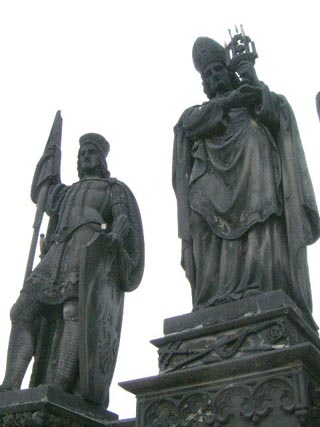 this is a famous bridge, called "charles bridge", leading from the city centre towards the really huge prague castle. there are a series of statues along each side of the bridge. this statue is of saint wenceslas and saint sigmund, doing something important by the looks of things.