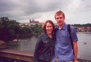 here is ren and i with some arches of the charles bridge to the right and the prague castle to the left on the hill. the guy that took this didn't seem very happy having to take a photo but we're smiling anyways